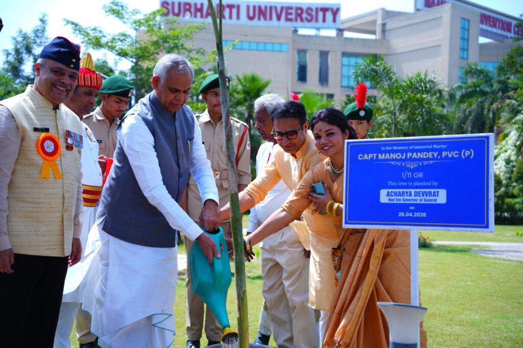 मुख्य अतिथि आचार्य देवव्रत ने अपने संबोधन में कहा कि सुभारती विश्वविद्यालय के 11वें दीक्षांत समारोह में उपस्थित होने का सौभाग्य मिला । सुभारती विश्ववविद्यालय की कुलाधिपति, कुलपति व विश्वविद्यालय के संस्थापक एवं समस्त पदाधिकारियों को पिछले दो दशक से देश की भावी पीढ़ीयों के निर्माण के लिए हार्दिक बधाई देता हुं। उन्होंने कहा कि दीक्षांत समारोह पठन-पाठन प्रक्रिया का अंतिम चरण होता है। अपने संबोधन में आचार्य देवव्रत ने कहा कि प्राचीन काल में शिक्षक अथवा गुरु दीक्षांत समारोह के दिन अपने विद्यार्थियों को अपना अंतिम उपदेश देते थे। जिसमें वे उन्हें सत्य का आचरण करना, धर्म का आचरण करना व सदाचार, सद्भाव व सम्यक विचार के साथ जीवन जीने का मंत्र देते थे। मुख्य अतिथि मे कहा कि स्वाध्याय निरंतर चलने वाली प्रक्रिया है इसे कभी रुकना नहीं चाहिए। आपके (विद्यार्थियों) द्वारा वर्षों की कठिन साधना और परिश्रम प्राप्त विद्या को विस्तारित करते हए उसे समाज के जरुरतमंद लोगों के मध्य बांटिए। माता-पिता तथा आचार्य देवतुल्य होते हैं उनके प्रति आपको अपने कर्तव्यों को सदा याद रखना चाहिए। हमें अपने माता-पिता को जिन्होंने हमें अथक परिश्रम व त्याग के द्वारा हमें अच्छी और उच्च शिक्षा दिलवाई जिसके कारण समाज में हमें मान सम्मान और अच्छे वेतन की नौकरी मिल रही है या हम एक सफल उद्यमी बन पाए हैं उनके इस त्याग और तप को नहीं भूलना चाहिए। हमें सदा उन्हें सम्मान देते हुए अपने साथ ही रखना चाहिए। देश में बढ़ रहे वृद्धाश्रमों की संख्या के प्रति अपनी चिंता जाहिर करते हुए माननीय राज्यपाल ने कहा कि वृद्धाश्रम भारतीय संस्कृति का हिस्सा नहीं रहे, ये यूरोप एवं पश्चिम के देशों की संस्कृति का भाग रही है किंतु भारत में इनका विस्तार होना दुर्भाग्य पूर्ण है। हमें अपने माता-पिता तथा गुरुओं का सदा सम्मान करना चाहिए इसी प्रकार हमें अपने गुरुओं और शिक्षकों को भी नहीं भूलना चाहिए क्योंकि आज जो भी डिग्री हम प्राप्त कर रहे हैं उसको प्राप्त करने में हमारे गुरुओं का भी अथक प्रयास और मेहनत रही है। उन्होंने स्वयं को जलाकर हमारे मार्ग को प्रशस्त किया है, गुरुओं के पास जो भी ज्ञान होता है वे अपना समस्त ज्ञान विद्यार्थियों को देने का प्रयास करते हैं ताकि उनका विद्यार्थी अपने जीवन में सफलता के उच्चशिखरों को प्राप्त कर सके। इसलिए हमें अपने गुरुजनों को कभी भी तिरस्कृत अथवा अपमान के भाव से ना देखना चाहिए ना ही उनके प्रति अनादर का व्यवहार करना चाहिए। उन्होंने आगे कहा कि डिग्री का अर्थ जिम्मेदार व्यक्ति बनना होता है। संस्कारित व्यक्ति ही समाज में सम्मान को प्राप्त करता है। उन्होंने सुभारती समूह के संस्थापक डॉ. अतुल कृष्ण के द्वारा 