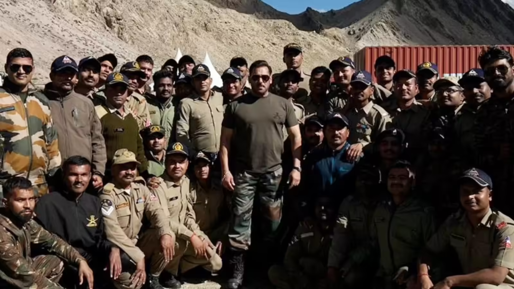 सोशल मीडिया पर सलमान खान और चित्रांगदा सिंह की एक तस्वीर वायरल है। यह तस्वीर ‘बैटल ऑफ गलवान’ की शूटिंग के सेट से ही है। इस तस्वीर में सलमान और चित्रांगदा दोनों ही भारतीय सेना की वर्दी में नजर आ रहे हैं। बैकग्राउंड में क्रू मेंबर्स को देखा जा सकता है। इस तस्वीर में सलमान और चित्रांगदा मुस्कुराते हुए एक फैन के साथ तस्वीर खिंचा रहे हैं। यह तस्वीर अब सोशल मीडिया पर वायरल है।इंडियाज मोस्ट फियरलेस 3′ उपन्यास पर आधारित है फिल्म