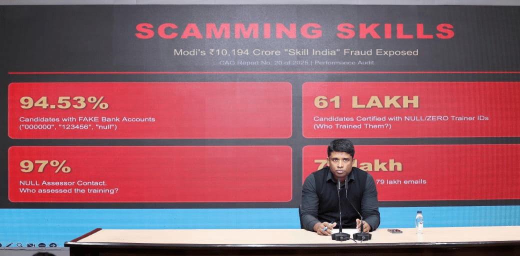कांग्रेस कार्यालय में पत्रकार वार्ता करते हुए कांग्रेस नेता कन्नन गोपीनाथन ने कैग (नियंत्रक एवं महालेखा परीक्षक) की रिपोर्ट का हवाला देते हुए कहा कि 2015 से 2022 तक की पीएमकेवीवाई की परफॉर्मेंस ऑडिट रिपोर्ट में योजना के हर स्तर पर भयंकर घोटाला सामने आया है। योजना में कुल 14 हजार करोड़ रुपए का प्रावधान था, जिसमें से लगभग 10 हजार करोड़ रुपए खर्च किए गए। 94.53 प्रतिशत लाभार्थियों के बैंक खातों के विवरण फर्जी पाए गए। 61 लाख प्रशिक्षकों का डेटा पूरी तरह खाली या गायब है; कहीं नाम दर्ज नहीं हैं, कहीं मोबाइल नंबर नहीं हैं और अन्य आवश्यक जानकारियां भी मौजूद नहीं हैं। प्रशिक्षण का मूल्यांकन करने वाले 97 प्रतिशत असेसर्स की जानकारी उपलब्ध नहीं हैं। लगभग एक करोड़ लोगों को ट्रेनिंग दिखाई गई है, जबकि प्रशिक्षुओं के ईमेल आईडी केवल एक-डेढ़ लाख ही दर्ज हैं।