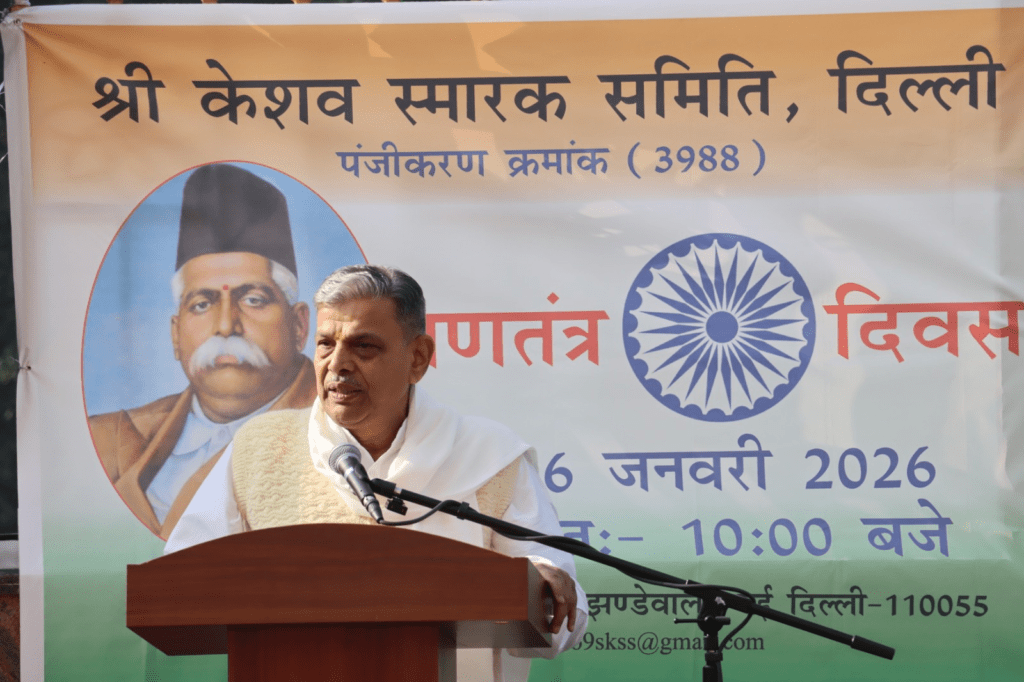 नई दिल्ली, 26 जनवरी। भारत के 77वें गणतंत्र दिवस के अवसर पर सोमवार 26 जनवरी 2026 को दिल्ली के केशवकुंज में राष्ट्रीय स्वयंसेवक संघ के माननीय सरकार्यवाह श्री दत्तात्रेय होसबाले जी ने झंडोत्तोलन किया तथा उपस्थित जनसमुदाय को संबोधित किया।