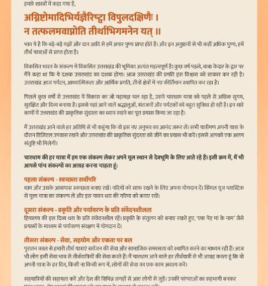 डिजिटल उपवास पर रहते हुए, उत्तराखंड की प्राकृतिक सुंदरता का आनंद लें तीर्थयात्री प्रधानमंत्री ने उत्तराखंड आने वाले तीर्थयात्रियों से पांच संकल्प अपनाने की अपील की*प्रधानमंत्री श्री नरेंद्र मोदी ने चारधाम यात्रा शुरु होने पर देशवासियों को शुभकामना सं...