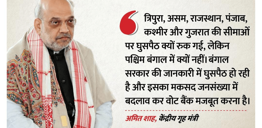 अमित शाह ने सवाल किया कि त्रिपुरा, असम, राजस्थान, पंजाब, कश्मीर और गुजरात की सीमाओं पर घुसपैठ क्यों रुक गई, लेकिन पश्चिम बंगाल में क्यों नहीं। उन्होंने कहा कि बंगाल में राज्य सरकार की जानकारी में घुसपैठ हो रही है और इसका मकसद जनसंख्या में बदलाव कर वोट बैंक मजबूत करना है। उन्होंने कहा कि आगामी चुनाव घुसपैठ रोकने और घुसपैठियों को बाहर निकालने इन्हीं मुद्दों पर लड़े जाएंगे। अमित शाह ने साफ कहा कि बंगाल सीमा से हो रही घुसपैठ देश की राष्ट्रीय सुरक्षा का मामला है और इसे हल्के में नहीं लिया जा सकता।मैंने सीएम ममता को लिखे सात पत्र- शाह
