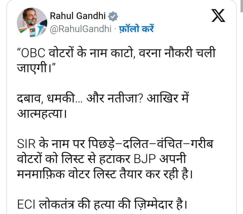 राहुल गांधी ने वीडियो को शेयर करते हुए एक्स पर लिखा ओबीसी वोटरों के नाम काटो, वरना नौकरी चली जाएगी। दबाव, धमकी… और नतीजा? आखिर में आत्महत्या। SIR के नाम पर पिछड़े–दलित–वंचित–गरीब वोटरों को लिस्ट से हटाकर BJP अपनी मनमाफ़िक वोटर लिस्ट तैयार कर रही है। ECI लोकतंत्र की हत्या की ज़िम्मेदार है। राहुल ने आगे कहा कि चुनाव आयोग इस लोकतंत्र की हत्या के लिए जिम्मेदार है।पश्चिम बंगाल निर्वाचन अधिकारी को चुनाव आयोग की चिट्ठी