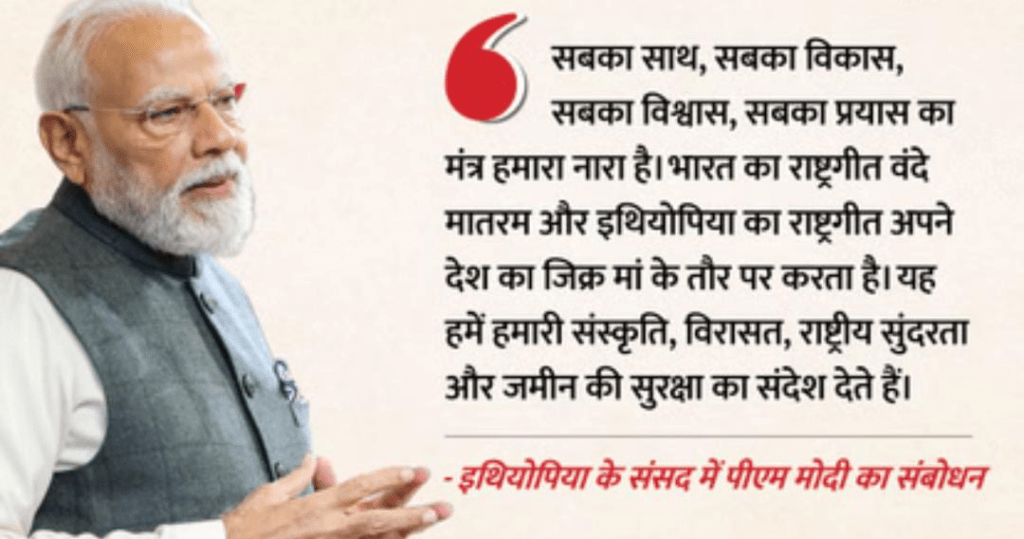 पीएम मोदी ने आगे कहा कि सबका साथ, सबका विकास, सबका विश्वास, सबका प्रयास के मंत्र हमारा नारा है। उन्होंने भारत का राष्ट्रगीत वंदे मातरम और इथियोपिया का राष्ट्रगीत अपने देश का मां के तौर पर जिक्र करता है। यह हमें हमारी संस्कृति, विरासत, राष्ट्रीय सुंदरता और जमीन की सुरक्षा का संदेश देते हैं।