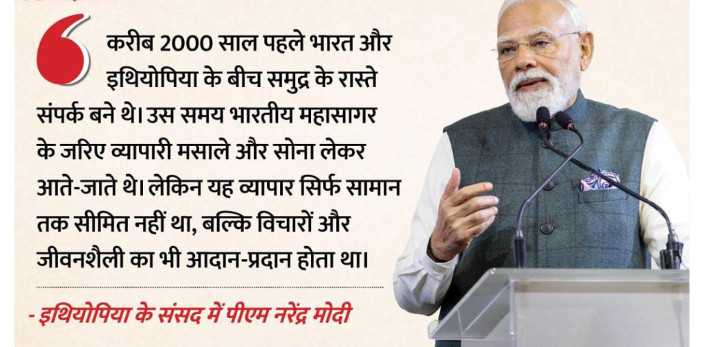पीएम मोदी ने बताया कि करीब 2000 साल पहले भारत और इथियोपिया के बीच समुद्र के रास्ते संपर्क बने थे। उस समय भारतीय महासागर के जरिए व्यापारी मसाले और सोना लेकर आते-जाते थे। लेकिन यह व्यापार सिर्फ सामान तक सीमित नहीं था, बल्कि विचारों और जीवनशैली का भी आदान-प्रदान होता था। उन्होंने कहा कि अदीस अबाबा और धोलावीरा जैसे बंदरगाह सिर्फ व्यापार केंद्र नहीं थे, बल्कि सभ्यताओं को जोड़ने वाले पुल थे।